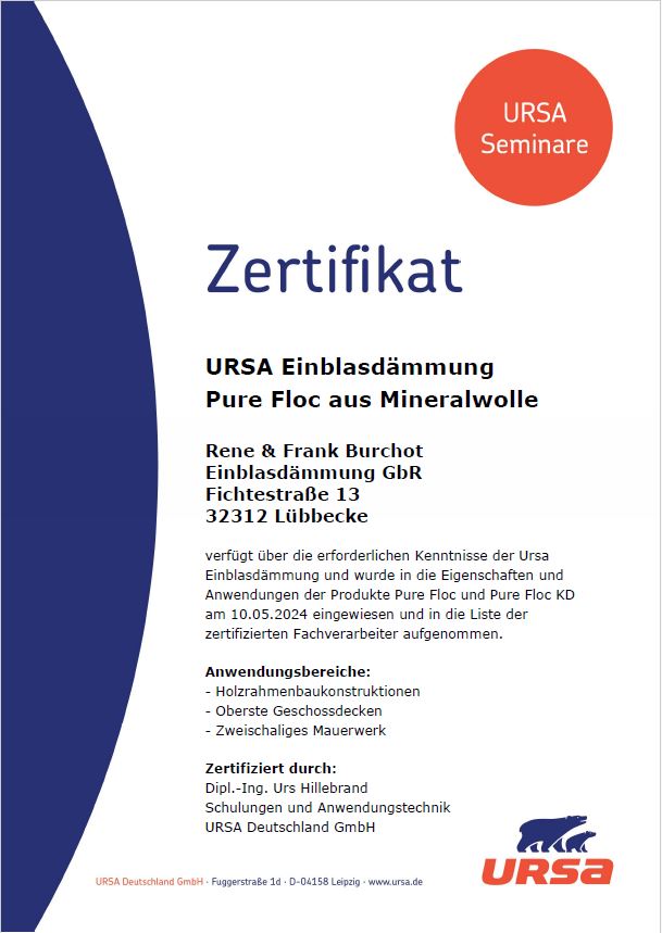 Zertifizierter Fachverarbeiter für URSA-Mineralwolle. Geschult in Technik, Einsatzbereichen und korrekter Verarbeitung für zweischaliges Mauerwerk und oberste Geschossdecken.