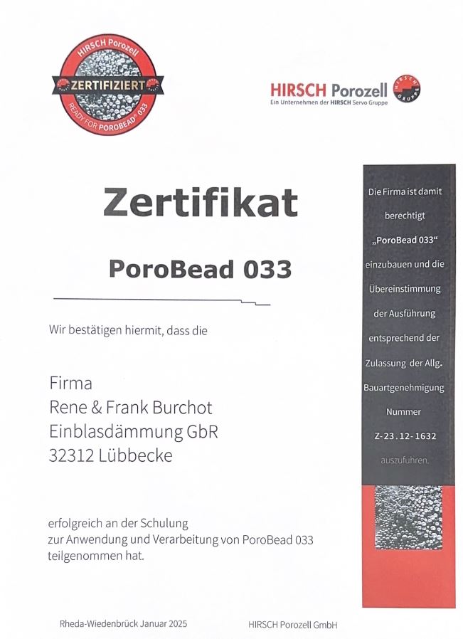 Offizielle Schulung für die Verarbeitung von PoroBead 033. Berechtigt zur fachgerechten und zulassungskonformen Ausführung nach bauaufsichtlichen Vorgaben.