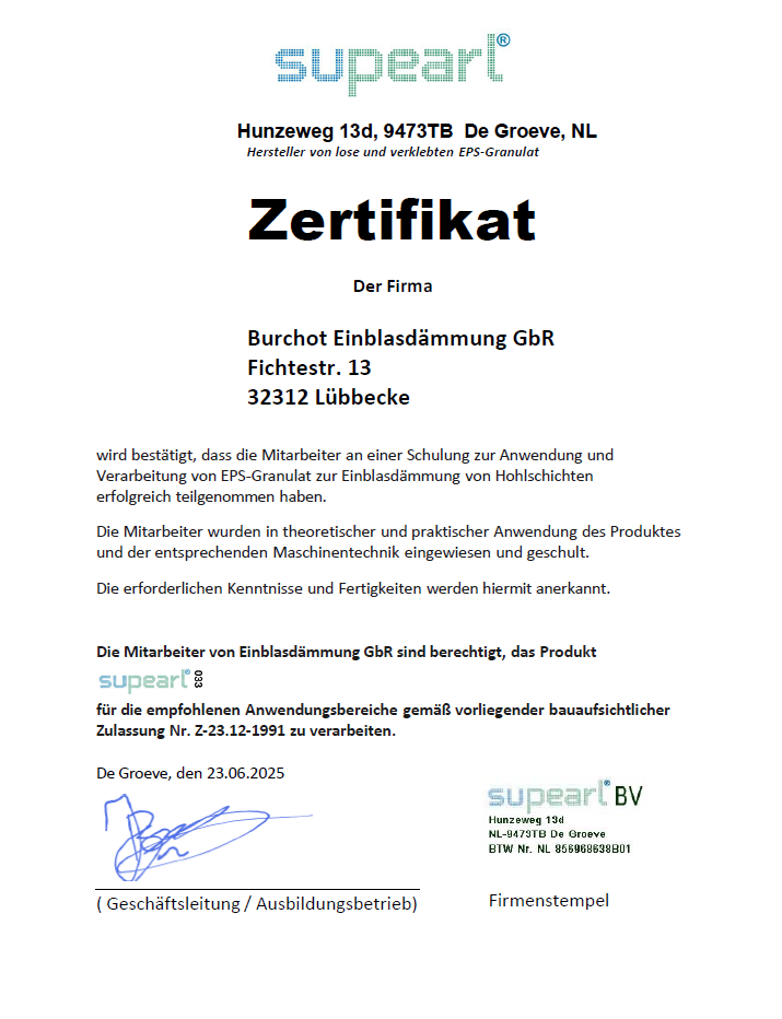 Zertifizierung für die Anwendung von EPS-Granulat in Hohlschichten. Bestätigt theoretische und praktische Kenntnisse der Maschinentechnik und Materialverarbeitung.