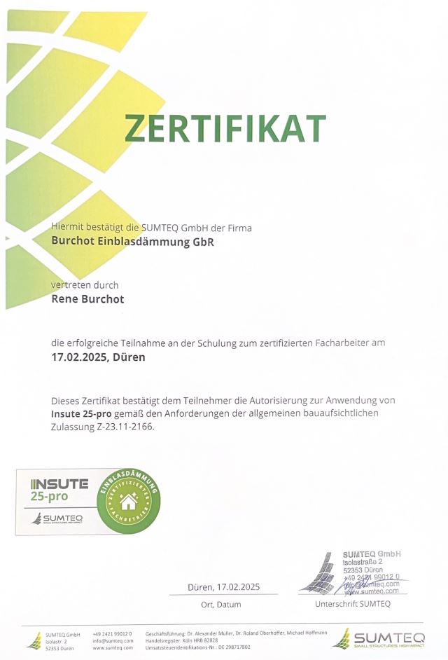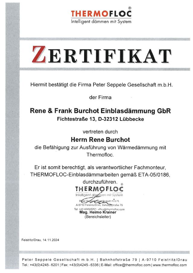 Qualifikation zur Ausführung von THERMOFLOC-Einblasdämmungen gemäß ETA-Zulassung. Bestätigt tiefgehende Produktkenntnisse und sichere Verarbeitung.
