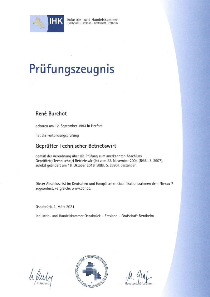Hochwertiger Abschluss auf Niveau 7 (Master-Niveau). Steht für betriebswirtschaftliches Know-how kombiniert mit technischem Verständnis und Organisationskompetenz.