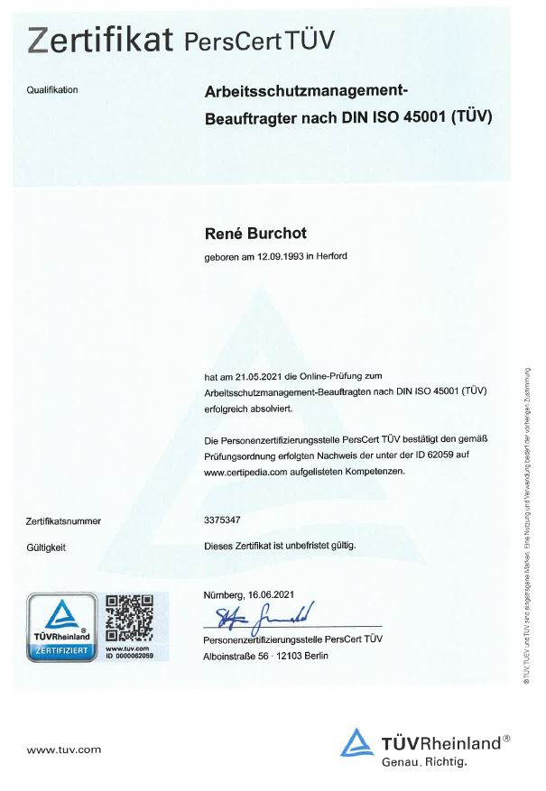Dieses Zertifikat bestätigt fundierte Kenntnisse im Arbeits- und Gesundheitsschutz sowie die Fähigkeit, sichere Arbeitsprozesse nach ISO-Standards umzusetzen.