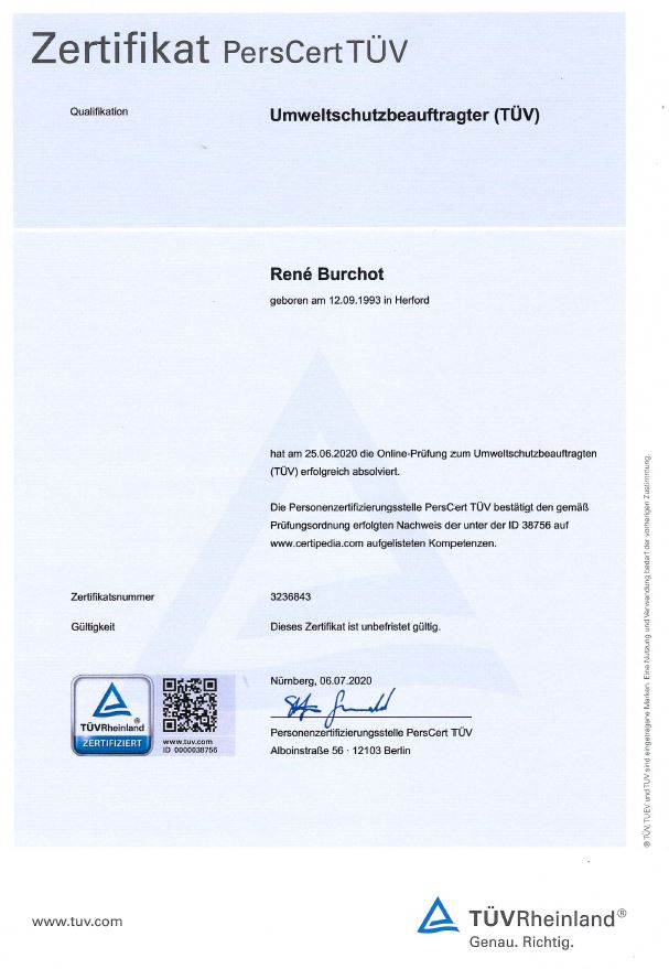 Der Nachweis über geschulte Fachkenntnisse im betrieblichen Umweltschutz. Belegt nachhaltiges Arbeiten und den verantwortungsvollen Umgang mit Ressourcen und Umweltvorgaben.