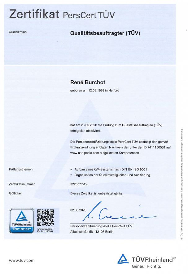 Bescheinigt die Kompetenz, Qualitätsmanagement-Systeme aufzubauen, Prozesse zu überwachen und dauerhaft hohe Arbeitsstandards sicherzustellen.